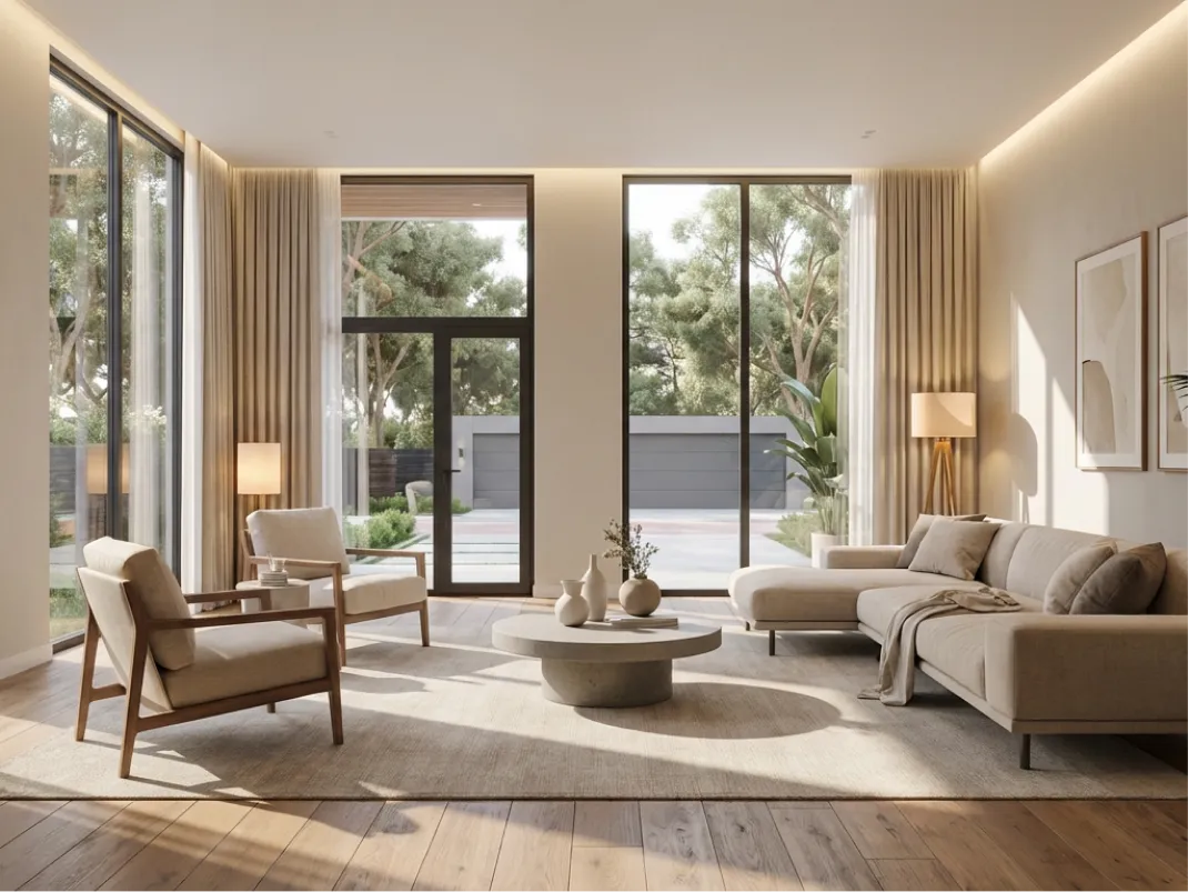 Spacious living and dining area. Modern open kitchen. Large windows with natural lighting. Private balcony with open view. High-quality finishing materials.